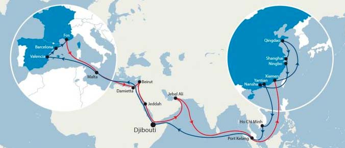 Gracias a la oferta de transbordo en este importante centro de CMA CGM, se ofrecen soluciones de transporte para los Estados Unidos, Europa del Norte y el Mediterráneo. Los doce buques desplegados en el MEX, con una capacidad de entre 9.400 y 11.400 TEUs, seguirán la siguiente rotación: Valencia, Barcelona, Fos sur Mer, Malta, Damietta, Beirut, Jeddah, Jebel Ali, Port Kelang, Xiamen, Qingdao, Shanghai, Ningbo, Nansha, Yantian, Ho Chi Minh, Port Kelang, Djibouti, Malta y Valencia.