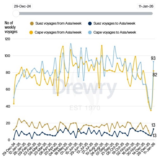 El número de viajes a través del Cabo de Buena Esperanza también aumentó en la semana 2, a 203, desde 82 en la semana anterior.